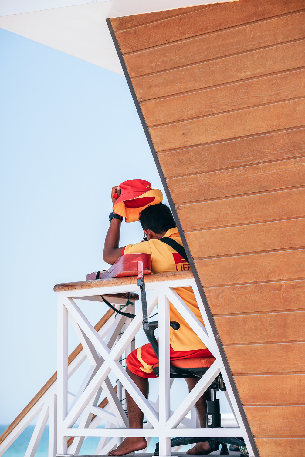 A lifeguard sitting at his station and carefully observing swimmers