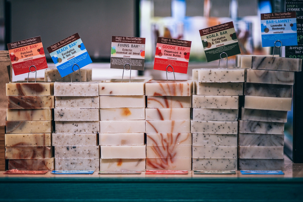 Stacked organic soap bars with multiple different scents for sale at a grocery store.