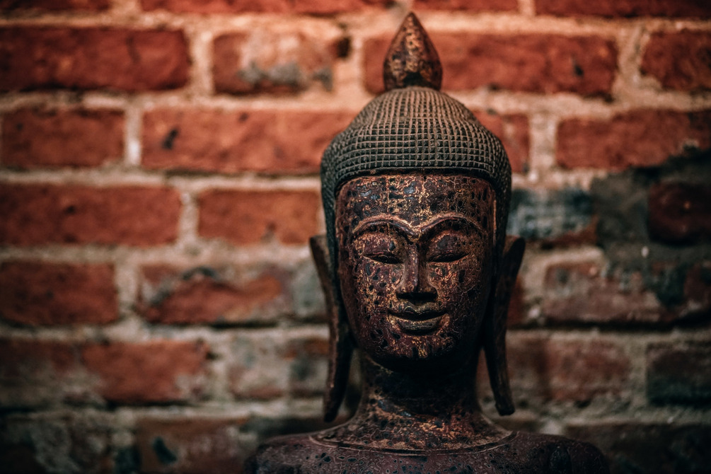 A wooden Buddhist statue in front of a brick wall
