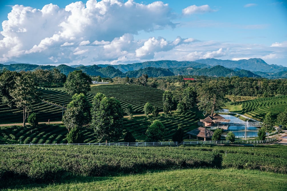 Tea plantation in Chiang Rai under white fluffy clouds.