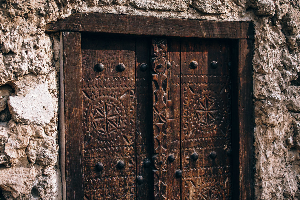 An old wooden door in an old stone building. The door has multiple symbols carved on it.