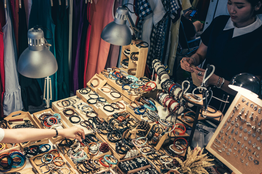 Woman checking out handmade bracelets and other jewelry at a creative market