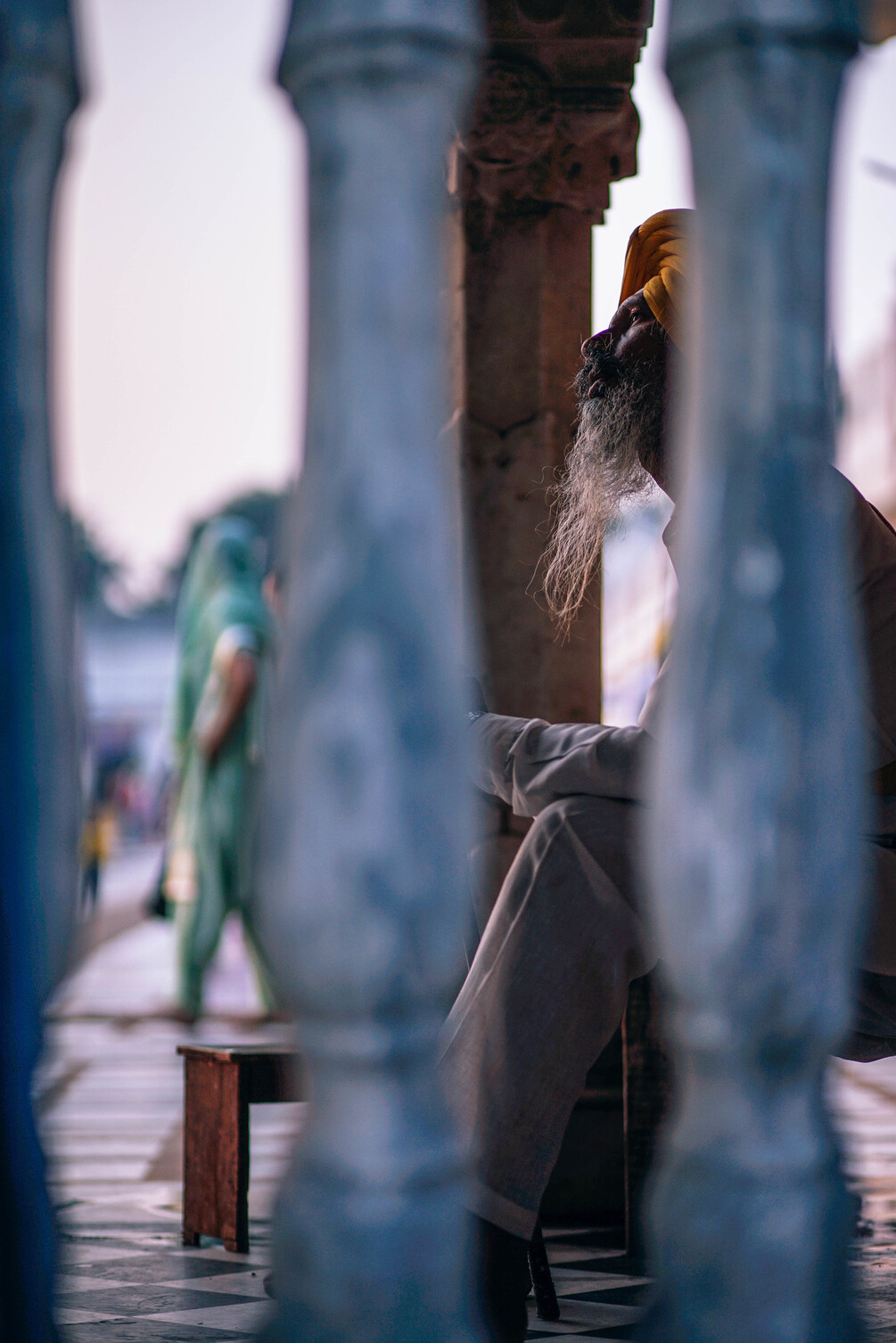 Religious Man Sitting inside Gurudwara Bangla Sahib (3849 x 5773px)