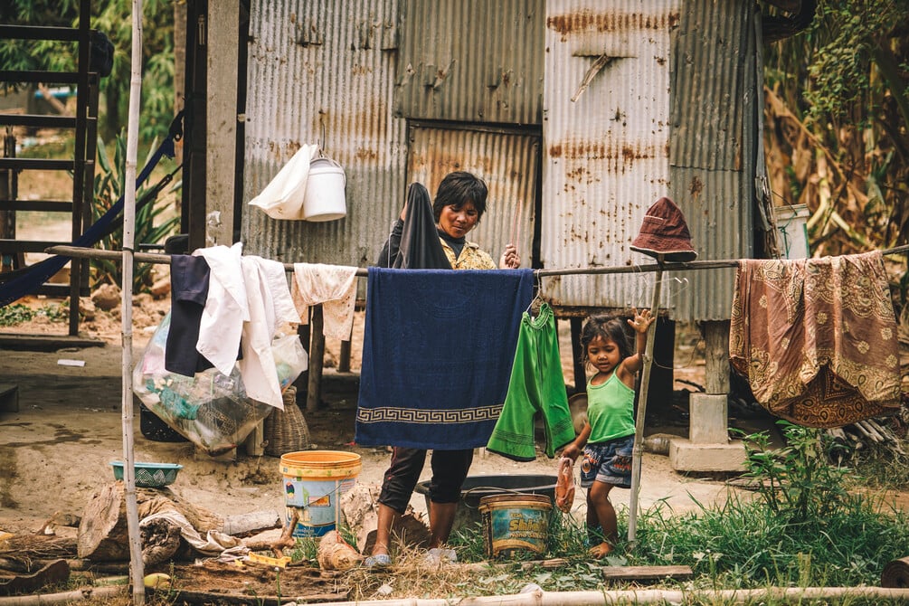 Mother and daughter hanging washed clothes in Cambodia