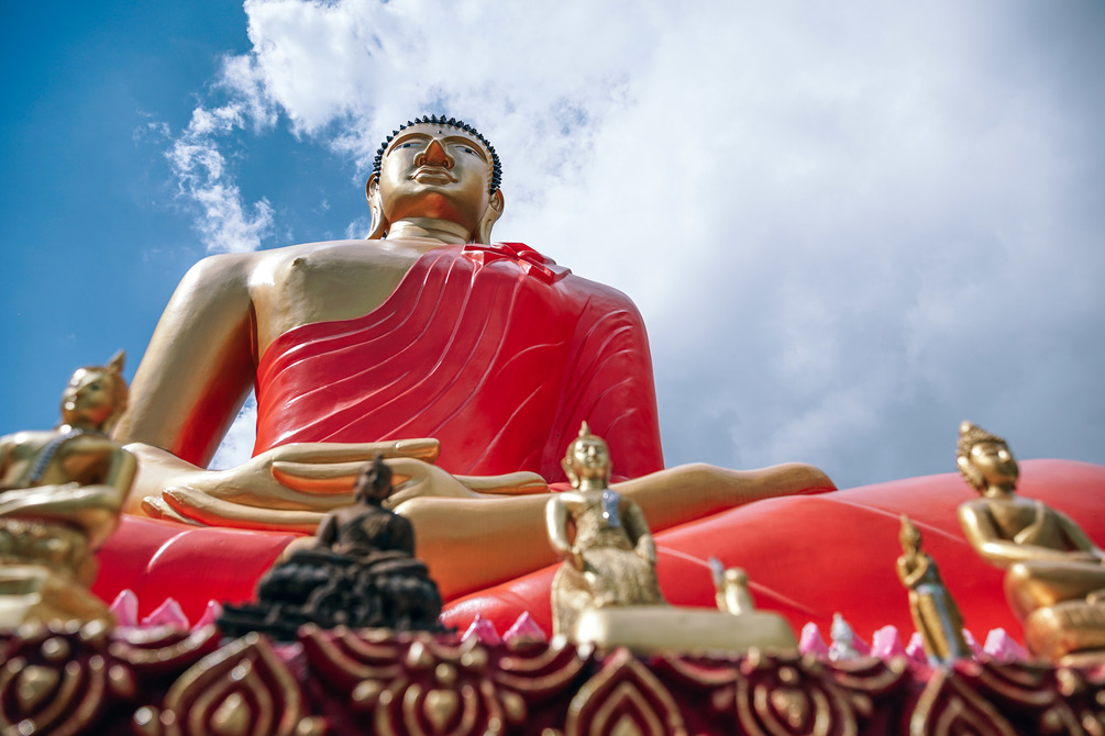 Giant statue of Buddha with other smaller Buddhist statues in front of it.