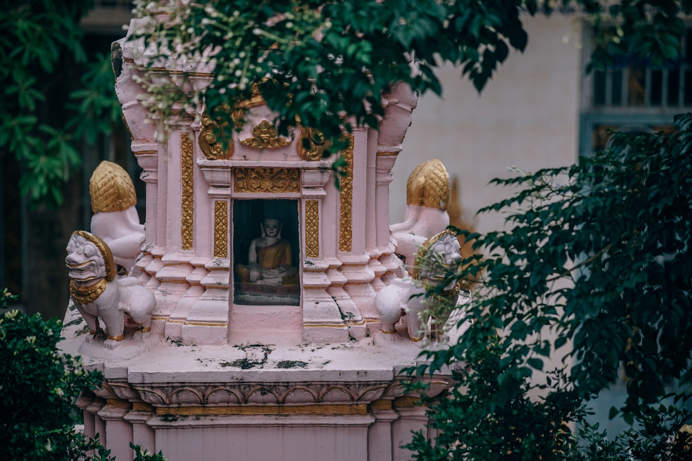 Small Pink Temple with Golden Decorations and a Buddha Statue Inside (5887 x 3925px)