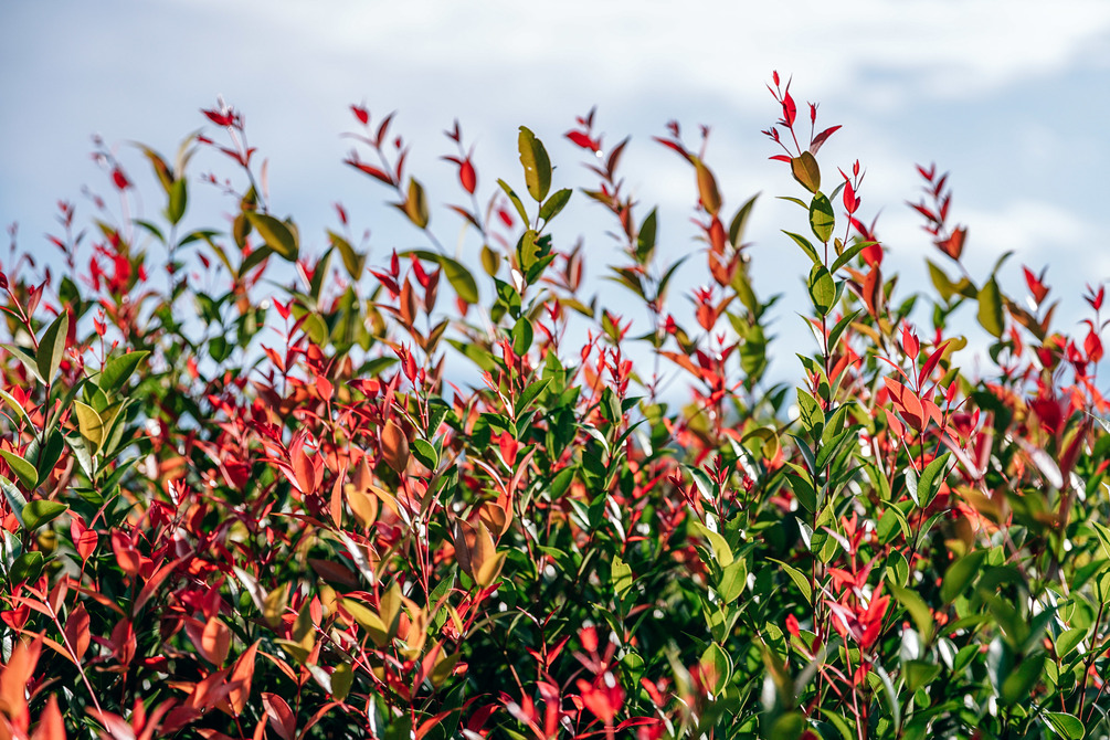 Green and pink leaves on a sunny day underneath the sky.