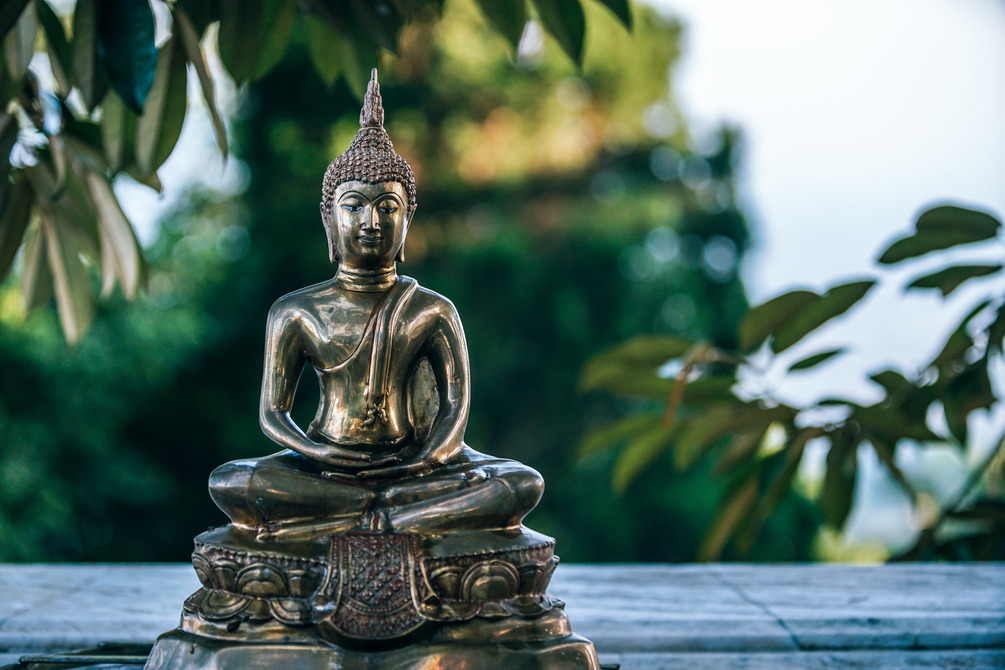 Small Golden Buddha Statue surrounded by Green Leaves (6000 x 4000px)