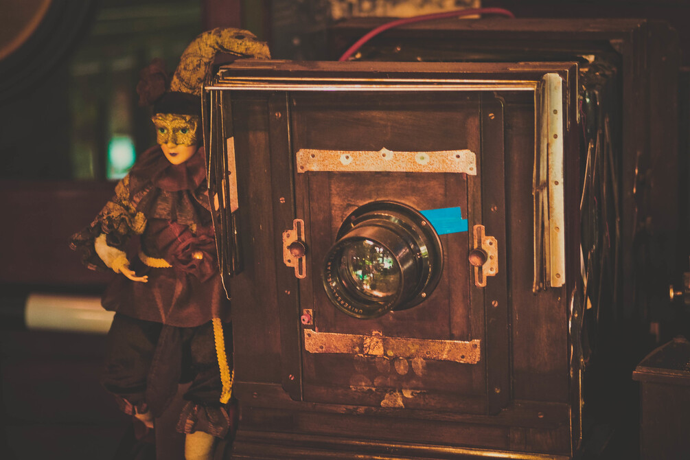 Plastic masked doll placed next to a vintage wooden camera.
