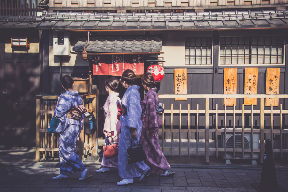Women dressed in traditional Japanese clothes strolling through Kyoto.