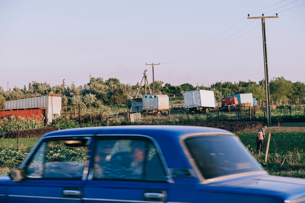 Blue car driving on the roads of Dzhankoy, Crimea.