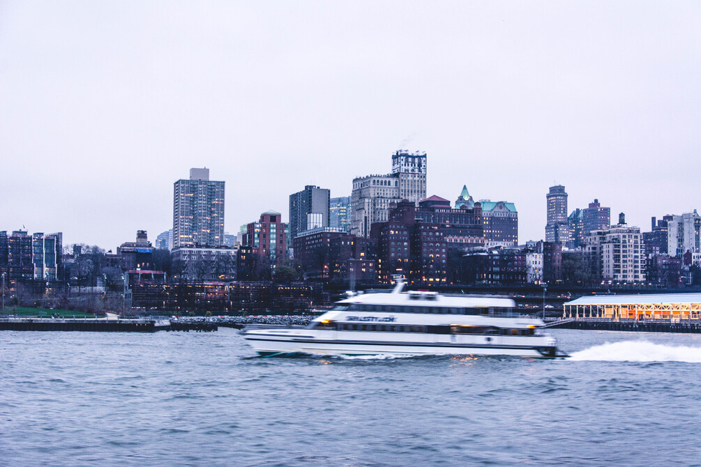 Speedboat driving through New York City photographed in front of buildings with stunning architectural design