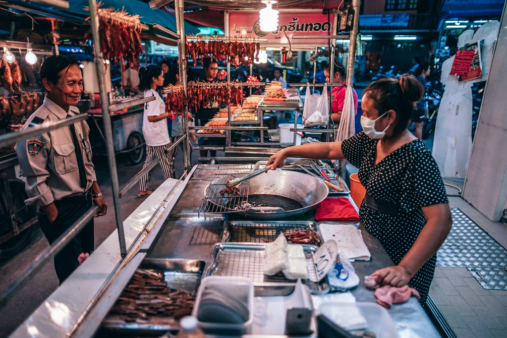 Woman Preparing Pork for Customers at the Phantip Night Market (5629 x 3753px)