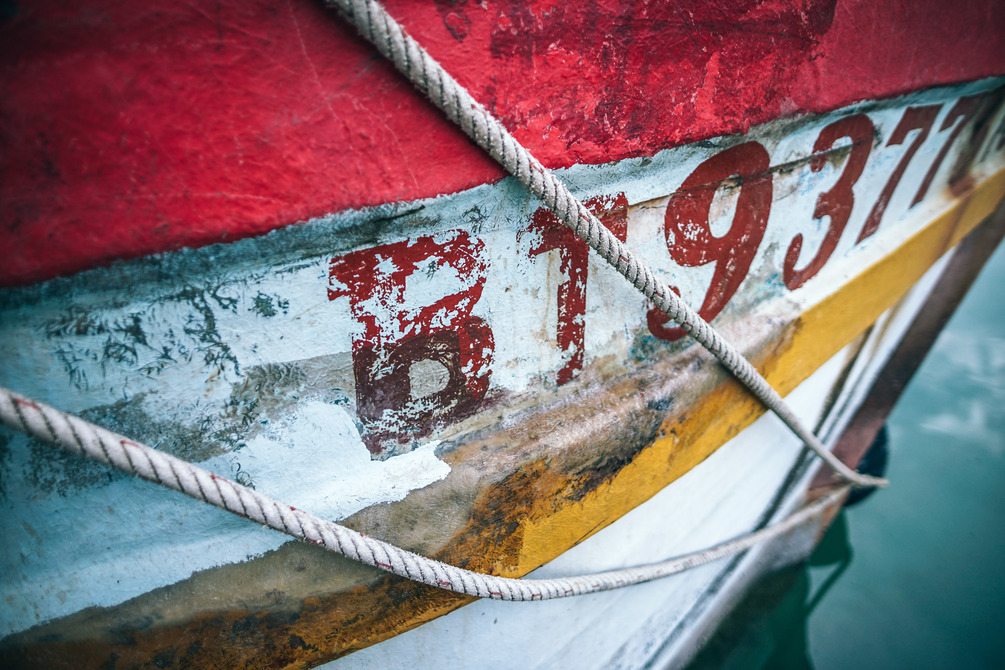Close-up shot of the side of an old wooden Thai boat painted in red and yellow.