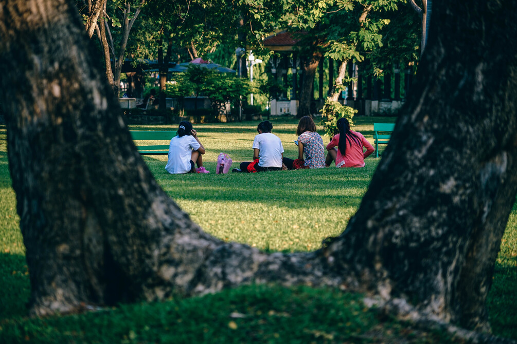 Friends Sitting on the Freshly Cut Grass in Lumphini Park (6000 x 4000px)