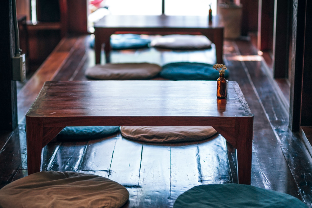 Empty tables and sitting cushions at the Magokoro Japanese teahouse.